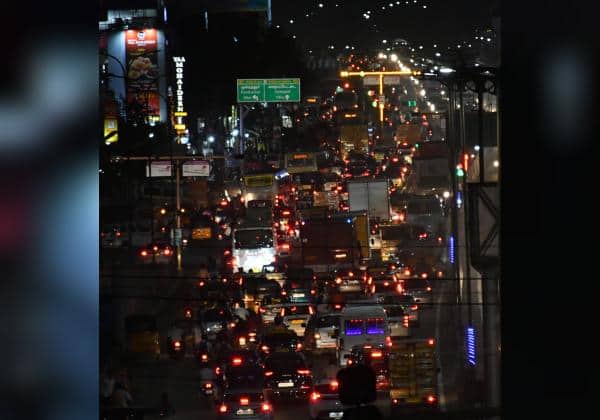 பல்லாவரம் ஜி.எஸ்.டி. சாலையில் ஏற்பட்ட போக்குவரத்து நெரிசலில் சிக்கி ஊர்ந்து செல்லும் வாகனங்கள் .