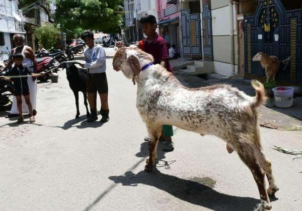 பக்ரீத்தை முன்னிட்டு குர்பானிக்கான ஆடுகளை பிடித்து செல்லும் சிறுவர்கள். இடம்: திருப்பூர் கோம்பை தோட்டம்.