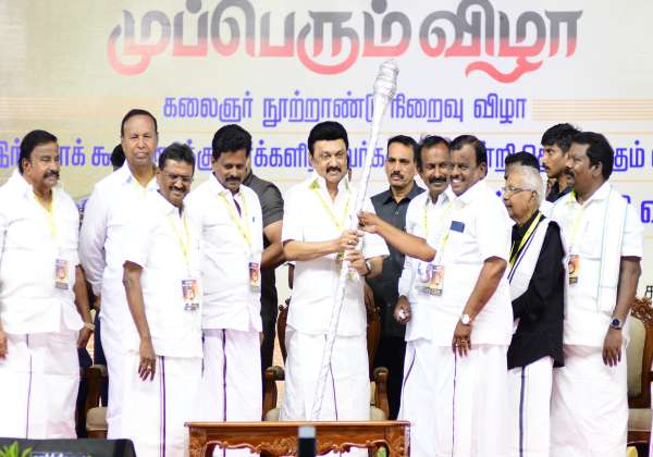கோவை கொடிசியா அருகேயுள்ள மைதானத்தில் நடந்த மும்பெரும் விழாவில் கலந்து கொண்ட முதல்வர் ஸ்டாலினுக்கு செங்கோல் வழங்கிய கட்சி நிர்வாகிகள்.