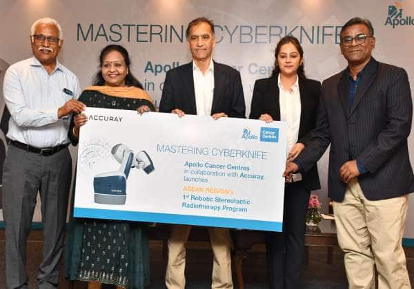 அப்பல்லோ புற்றுநோய் மருத்துவமனையில், துல்லியமான கதிர்வீச்சு சிகிச்சைக்கான, ஸ்டீரியோடாக்டிக் திட்டம் துவக்கப்பட்டது. இதில் இடமிருந்து வலம் - புற்றுநோய் கதிரியக்க சிகிச்சை துறை டாக்டர்கள் மஹாதேவ் போதராஜி, ரத்னாதேவி, சஞ்சய் சந்திரசேகர், அக்யுரே நிறுவனத்தின் மார்கெட்டிங் மேனேஜர் வர்டிகா மோங்கா மற்றும் புற்றுநோய் கதிரியக்க சிகிச்சை துறை முதுநிலை டாக்டர் சங்கர் வங்கிபுரம். இடம் : நுங்கம்பாக்கம், சென்னை