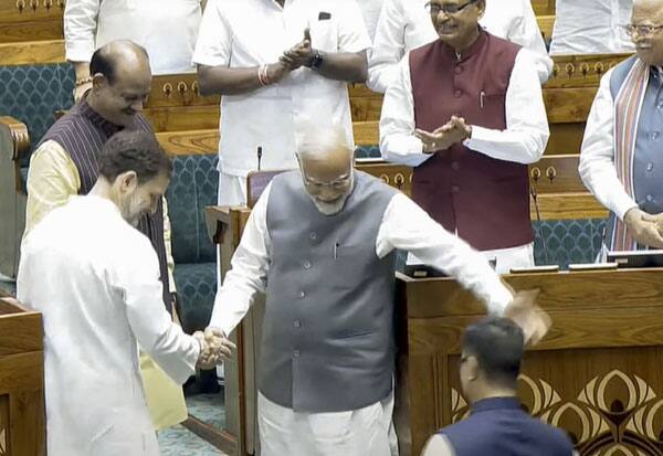 லோக்சபாவில் பிரதமர் மோடியும், எதிர்க்கட்சி தலைவர் ராகுலும் கைகுலுக்கி வாழ்த்துகளை பரிமாறி கொண்டனர்..