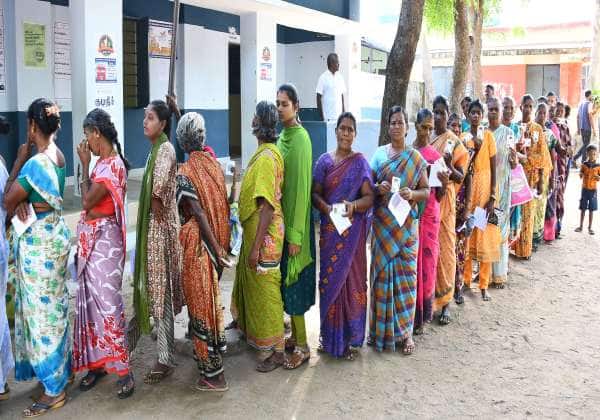 விழுப்புரம் மாவட்டம் விக்கிரவாண்டி இடைத்தேர்தலில் ஆர்வமுடன் ஓட்டளிக்க வந்த பெண்கள். இடம்: சூரப்பட்டு,