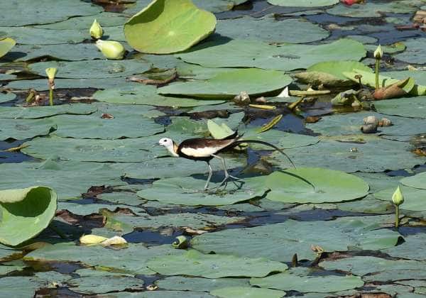 தாமரைக் குளத்தில் பூத்துள்ள தாமரைப் பூக்களுக்கு நடுவே இரை தேடும் நீளவால் தாழைக்கோழி எனும் தாமரைக் கோழி.இடம் : வேங்கைவாசல்.