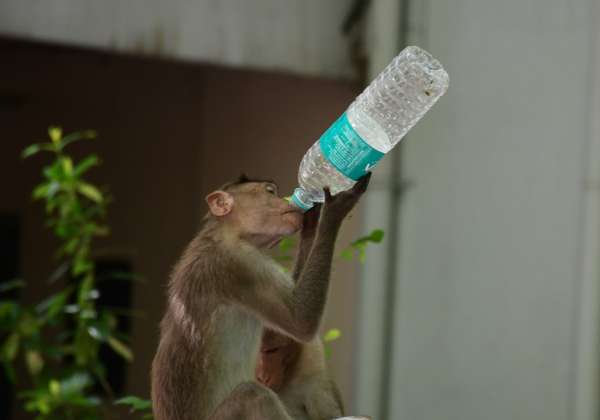 சென்னையில் வெயிலின் தாக்கம் அதிகமாக காணப்பட்டதால் தாகத்திற்கு குடிநீர் பாட்டிலில் மீதி இருந்த குடிநீரை எடுத்து பருகும் குரங்கு இடம் அண்ணா பல்கலைக்கழகம் அருகே.