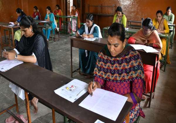 டி.என்.பி.எஸ்.சி., குரூப் - 1 தேர்வு எழுத வந்த பெண்கள். இடம்: கோவை பெரிய கடை வீதி புனித மைக்கேல் மேல்நிலைப்பள்ளி.