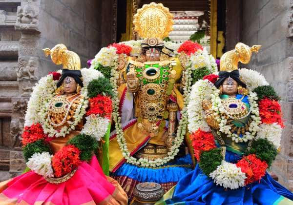 ஆடி திருவிழாவை முன்னிட்டு தாடிக்கொம்பு சவுந்தரராஜ பெருமாள் கோயிலில் கொடியேற்றத்தில் எழுந்தருளிய பெருமாளுடன் ஸ்ரீதேவி, பூதேவி.