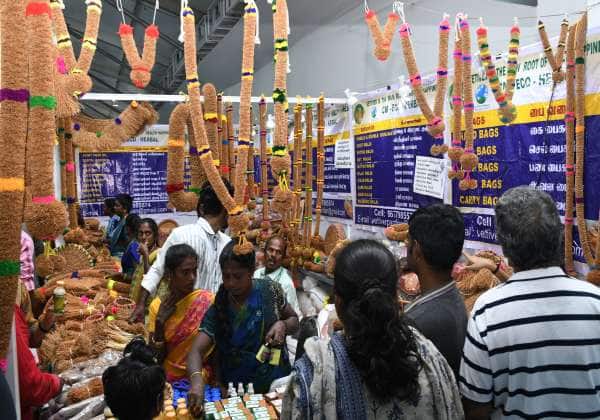 கோவை கொடிசியா அரங்கில் நடந்த அக்ரி இன்டெக் 2024 கண்காட்சியில் காட்சிப்படுத்தப்பட்டுள்ள வெட்டிவேரில் தயாரிக்கப்பட்டுள்ள பொருட்களை பார்வையிட்ட மக்கள்.