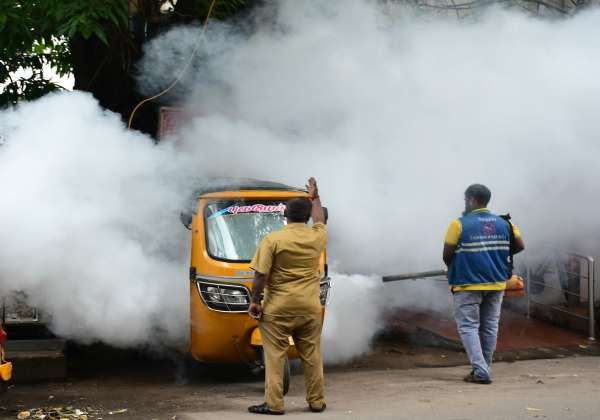 கொசு உற்பத்தியை தடுக்கும் வகையில் மாநகராட்சி பணியாளர் சென்னை மயிலாப்பூரில் உள்ள வீர பெருமாள் கோவில் தெருவில் கொசு ஒழிப்பு மருந்து அடித்தனர்.
