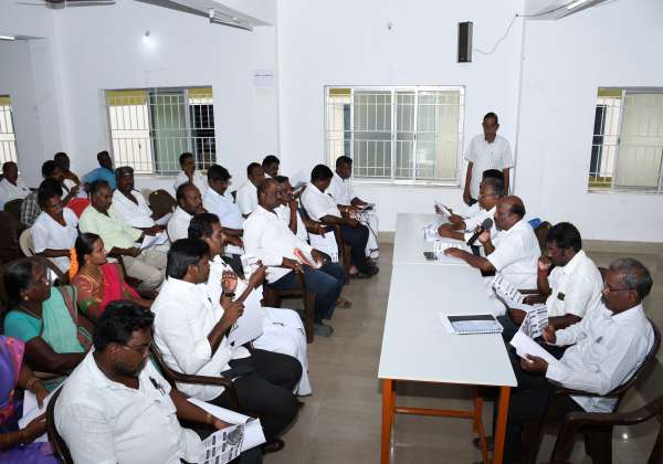 கோலியனூர் பிடிஓ அலுவலகத்தில் நடந்த கூட்டத்தில் சேர்மன் சச்சிதானந்தம் பேசினார்.