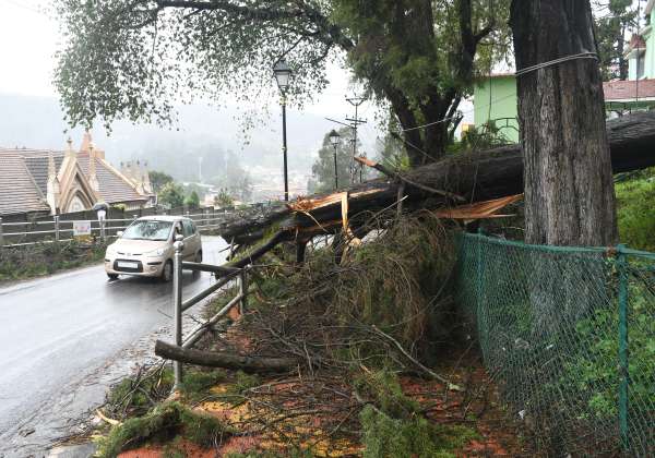 ஊட்டி ஸ்பென்சர் சாலை, நடைபாதையில் விழுந்த மரம் , அகற்றப்படாத காரணத்தினால் பாதசாரிகளுக்கு இடையூறு ஏற்படுகிறது.
