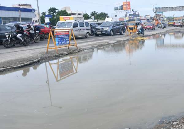 பல்லாவரம் - துரைப்பாக்கம் ரேடியல் சாலை, அணுகு சாலையில் குளம்போல் தேங்கியுள்ள மழைநீர்.இடம்: சுண்ணாம்பு கொளத்தூர்.