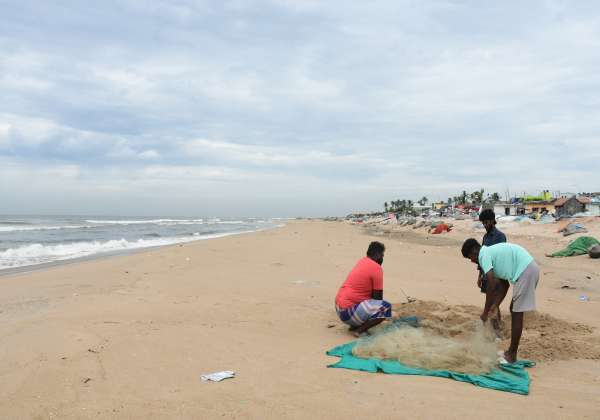 பட்டினப்பாக்கத்தில் கடற்கரை சில தினங்களாக உள்வாங்கி காணப்பட்டதால் மணலில் புதைந்திருந்த மீன் பிடி வலைகளை எடுக்கும் பணியில் மீனவர்கள் ஈடுபட்டனர்.