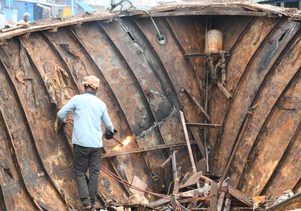 சென்னை காசிமேடு மீன்பிடி துறைமுகத்தில் புயலால் சேதமடைந்த நீண்ட நாட்களாக நிறுத்தி வைக்கப்பட்ட படகுகளை அகற்றும் பணியில் ஈடுபட்டுள்ள ஊழியர்.