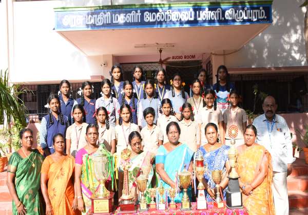 விழுப்புரம் அரசு மகளிர் மேல்நிலைப் பள்ளியில் மாநில அளவிலான விளையாட்டுப் போட்டிகளில் பங்கேற்ற மாணவிகளுக்கு தலைமை ஆசிரியர் சசிகலா பாராட்டு தெரிவித்தார்.