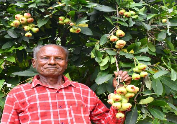 சிவகங்கை அருகே கண்டாங்கி பட்டி கிராமத்தில் ஒருவர் தோட்டத்தில் காய்த்து தொங்கும் வாட்டர் ஆப்பிள்.