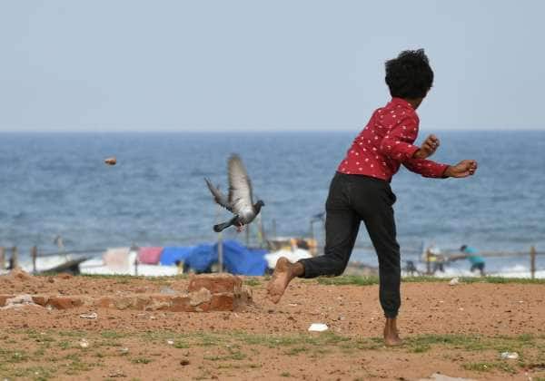 கடற்கரைகளில் இரை தேடி சுற்றித் திரியும் புறாக்களை கற்களால் அடித்து பிடிக்க முயற்சி செய்யும் சிறுவர்கள். இடம் : எலியட்ஸ் கடற்கரை, பெசன்ட் நகர்.