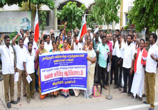 விழுப்புரம் அரசு மருத்துவமனை முன்பு தமிழ்நாடு பல்நோக்கு மருத்துவமனை பணியாளர் சங்கம் சார்பில் கவன ஈர்ப்பு ஆர்ப்பாட்டம் நடந்தது.