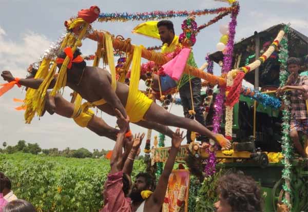 திருவண்ணாமலை மாவட்டம் மங்கலம் அடுத்த மட்டப்பாறை குன்றின் மேல் உள்ள பாலமுருகன் கோயிலில் ஆடி கிருத்திகையை முன்னிட்டு, நெல் அறுக்கும் இயந்திர வாகனத்தில் தொங்கியபடி நேத்திக்கடன் செலுத்தி வழிபட்ட பக்தர்கள்.