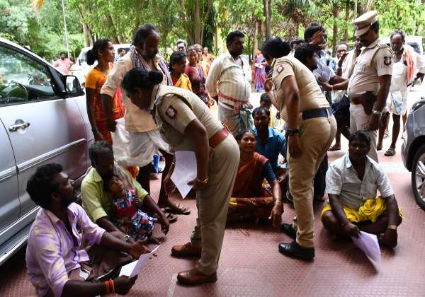 விழுப்புரம் கலெக்டர் அலுவலகம் முன்பு தீ குளிக்க முயன்று தர்ணா செய்தவர்களிடம் போலீசார் பேச்சு வார்த்தை நடத்தினர்.